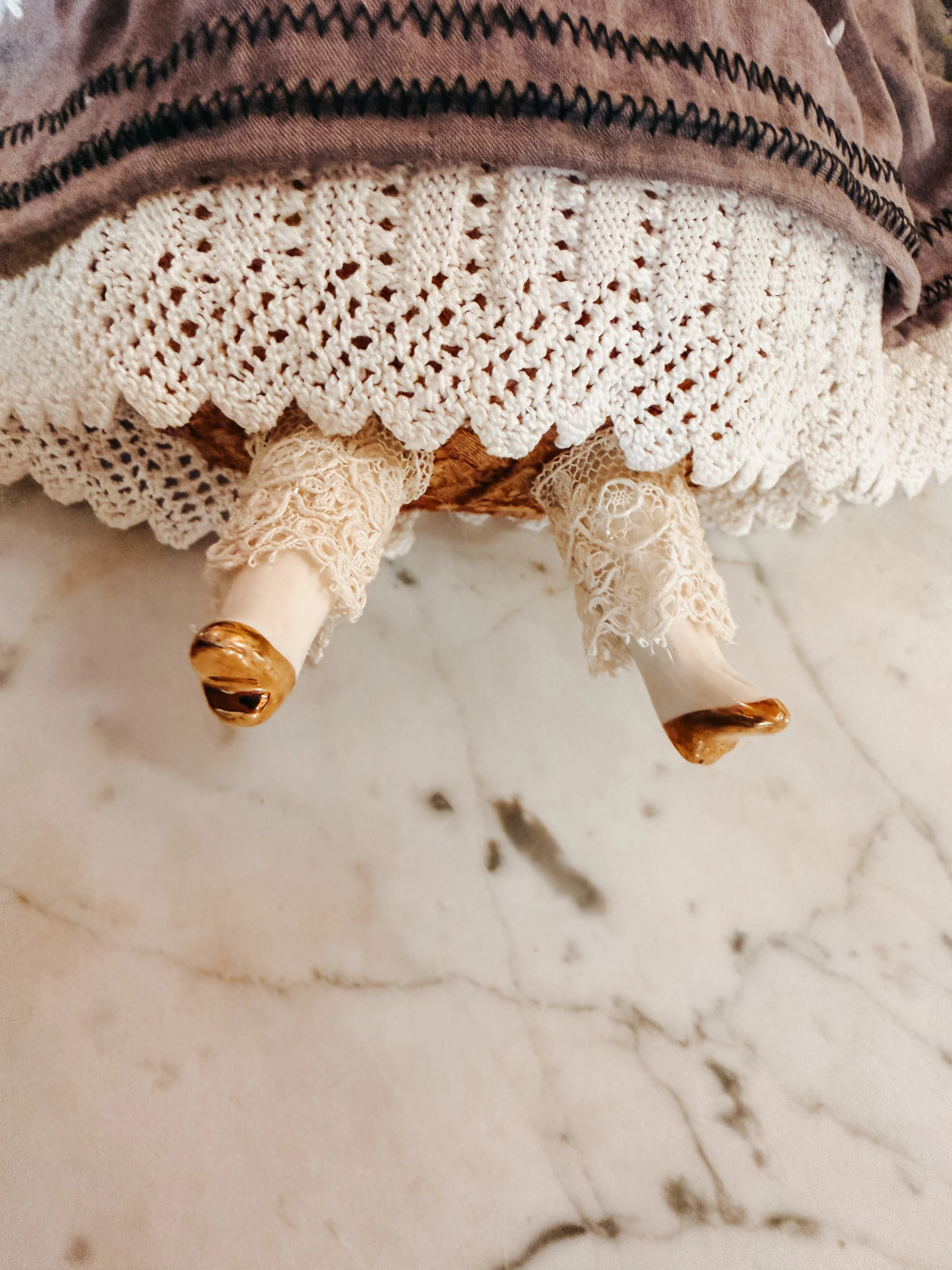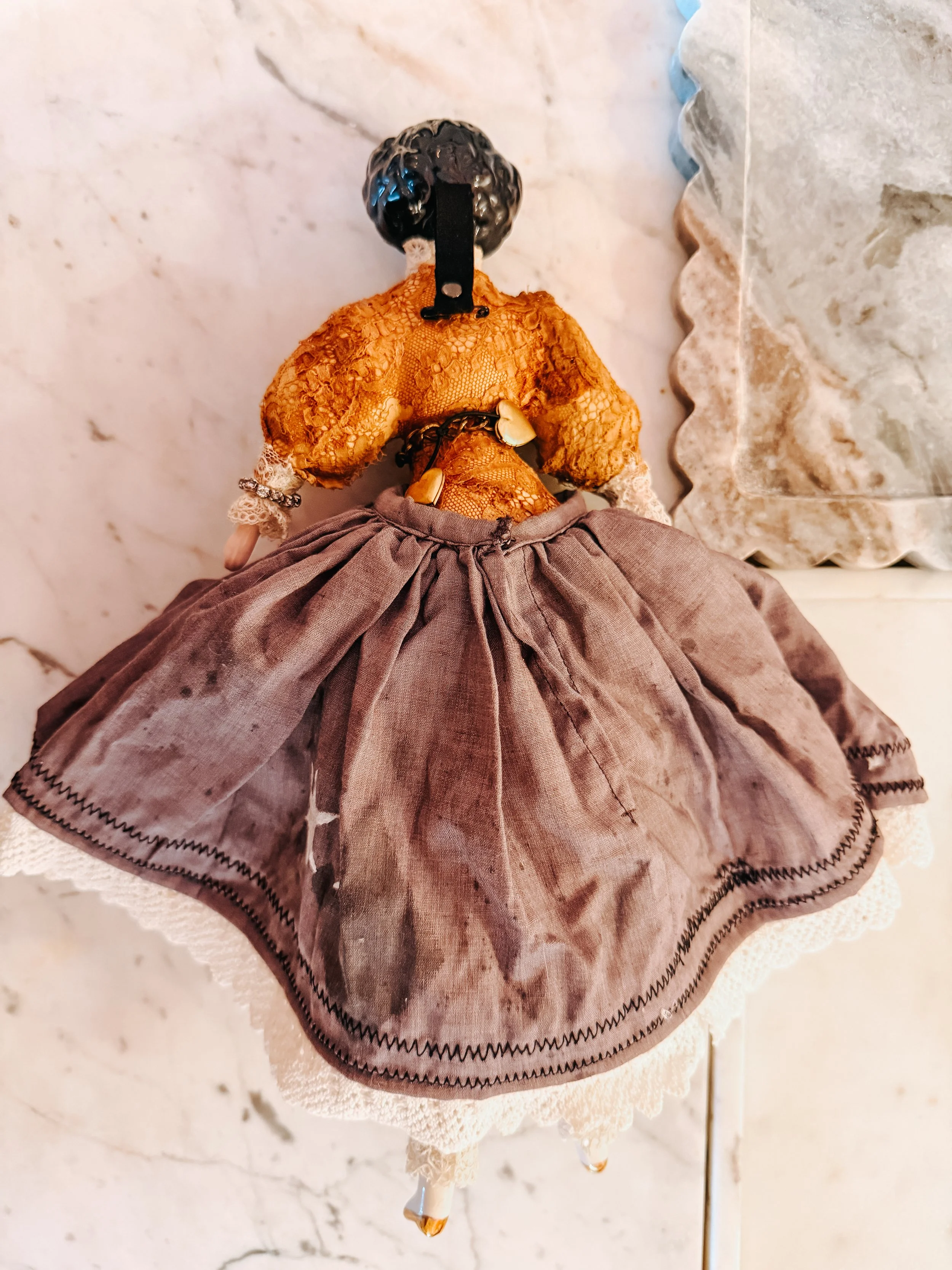 She has been restored: reinforced joints, repairs to original clothing, etc. I have stamped her with heart tattoos. She is wearing her original stockings, pantaloons, and leather shoes (hand-dyed, hand-painted and adorned with matching jewelry). Her bodice has the original lace netting. She wears a hand-dyed and painted underskirt with a vintage hand-dyed mesh skirt on top and an antique velvet doll jacket. She wears a rhinestone chest button, necklace and a heart ring on her hand.
