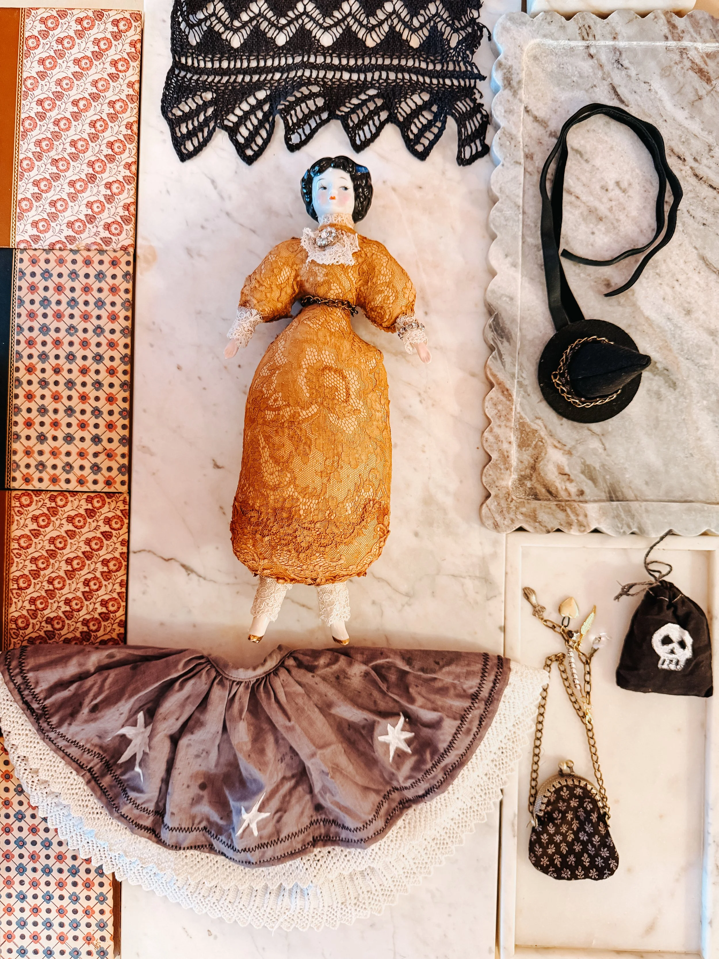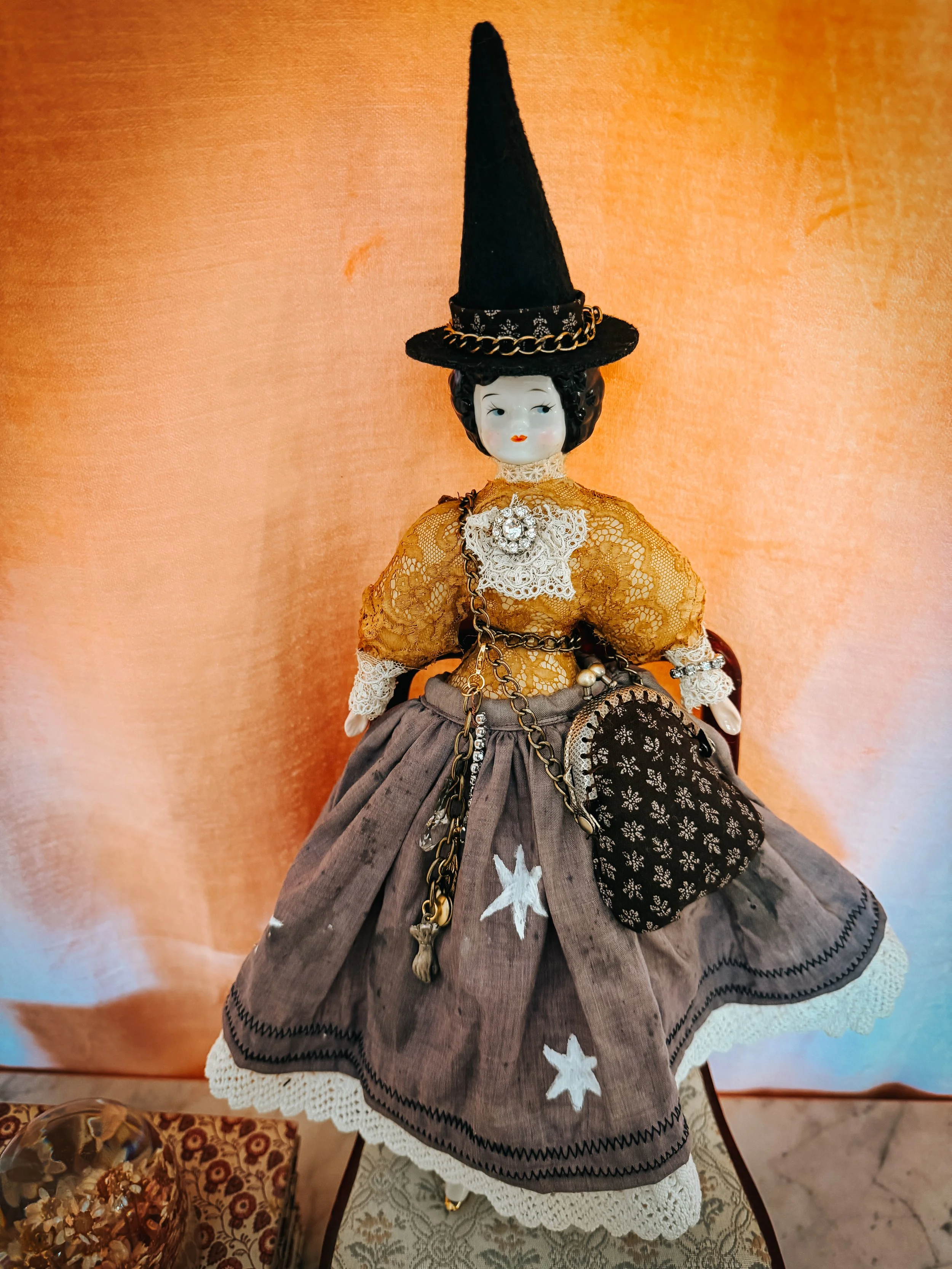 She has a black felt hat that can be affixed with a little Gorilla putty or tied on with the velvet ribbons. She has a little rose coin purse with its own purse charms, which can be detached. She wears a waist chain that matches her hat and bag full of poisonous and magical herbs.